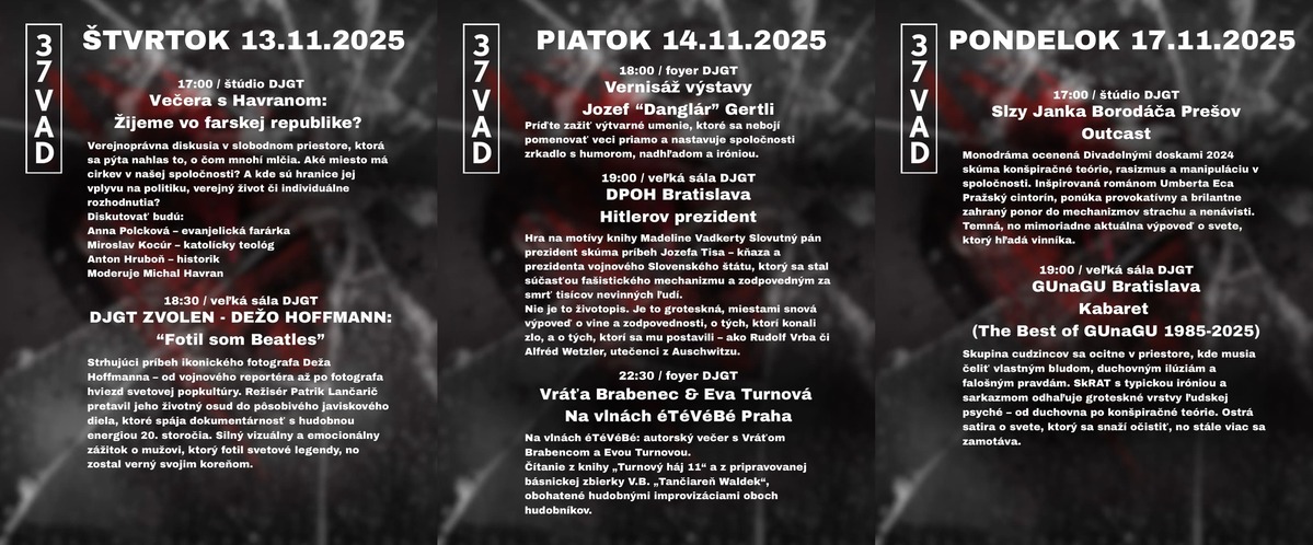Tento ročník má osobitý význam. Program silne reaguje na súčasné výzvy v spoločnosti i kultúre, pričom sa dotýka tém ako rozdelenie spoločnosti, historické traumy, polarizácia či ohrozenie kultúrnych inštitúcií. Festival si pripomína svoj vznik spojený s Nežnou revolúciou, ale zároveň prináša ostré a aktuálne kritické pohľady na dnešný stav kultúry a spoločnosti.