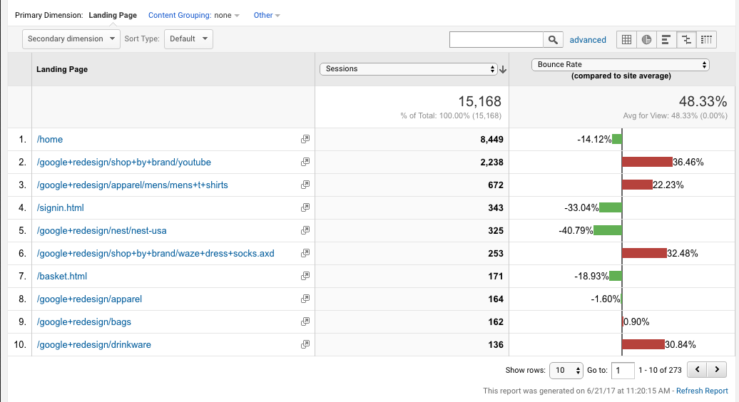 Ak pri porovnaní konverzných pomerov a mier odchodov na vašich vstupných stránkach zistíte, že podobne navrhnuté stránky (najmä, ak sú to šablóny) majú výrazne odlišné miery odchodov alebo vstupné stránky, pôjde asi o problém s optimalizáciou návštevnosti.