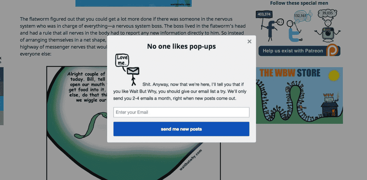 Myslím, že WaitButWhy robí dobrú prácu. Je to zábavné (samozrejme), kontextové okno je malé a keď sa spustí, nezničí celý zážitok z pozerania stránky.