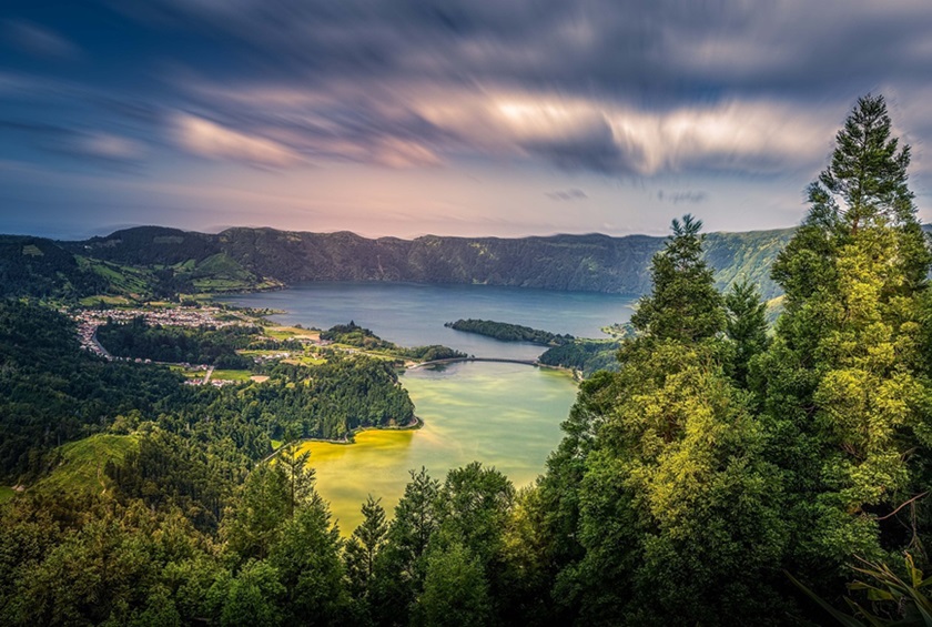 Sopečná činnosť formovala aj reliéf na Azorských ostrovoch. Ďalšie portugalské súostrovie je situované ešte hlbšie v Atlantickom oceáne, čo sa podpísalo na klíme jednotlivých ostrovov. Prebytok slnečného svetla a vysoké teploty kompenzuje prímorský vánok a svieža horská atmosféra prúdiaca z vyčnievajúcich vrcholov. Tie skrášľujú aj panorámu najväčšieho ostrova São Miguel s hlavným mestom Ponta Delgada. Na ostrove sú 2 sopky, najväčší vodopád na svete, jazerá Sete Cidades, oblasť Caldeira Velha pripomínajúca amazonskú džungľu aj ananásová plantáž s múzeom, ktoré prezentuje tradíciu zberu a spracovania týchto plodov. Na Azorských ostrovoch prežíva aj vinárska tradícia. Vinárska oblasť na ostrove Pico je chránená značkou UNESCO.