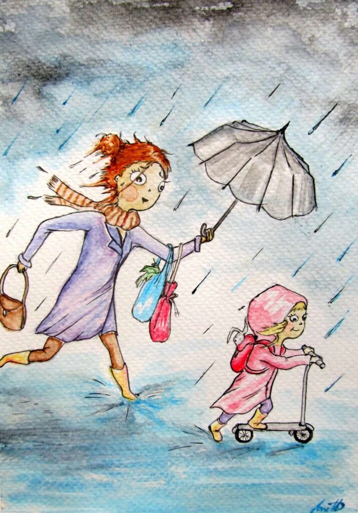 Dobehnem zmoknutá do škôlky, nafasujem dve deti, behom domov, zhodiť všetky veci, prezliecť do suchého obe decká aj seba, behom do susednej bytovky po kolobežku, zabaliť decka do pršiplášťov, nainštalovať na kolobežky a behom cez celé mesto do školy.