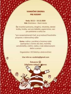 Samozrejme sú to finančné ťažkosti, obzvlášť v čase koronavírusu. Mamy samoživiteľky riešia otázku bývania, kam s deťmi ísť. Krízové centrá a ubytovne sú pre ne krajnou možnosťou. Seniorov zas máta osamelosť. Rodinky s inak obdarovanými deťmi trápia takisto financie. Väčšinou mama je tá, ktorá ostáva doma s dieťaťom. Rodina žije často len z jedného príjmu. Pričom výdavky na dieťa v podobe rehabilitácii, špeciálnych cvičení, strave a inom sú veľké až obrovské. Aj preto organizujem v novembri vianočnú zbierku s mottom „Zdieľame radosť z Vianoc.“