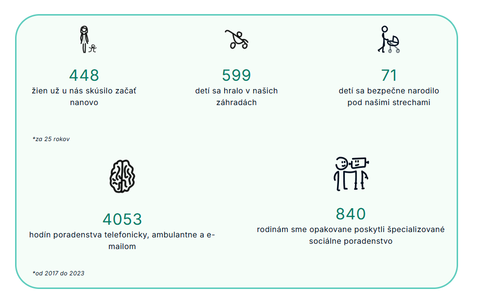 Organizácia ženami založená. Ženám pomáhajúca. Ženy zamestnávajúca. Za viac ako 27 rokov poskytla bezpečné bývanie už viac ako 1 150 osamelým ženám s deťmi. Rieši neľahké témy domáceho násilia. Vie, čo je bolesť, strach či bezmocnosť. Pozná tragédie odohrávajúce sa za zatvorenými dverami mnohých domov či bytov. Pomáha, utešuje, stavia na nohy.