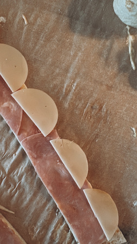 - Plátkový syr: Na šunku naukladaj polovičky plátkového syra. Syrové polkruhy ukladaj k jednému okraju tak, aby mierne prečnievali von.