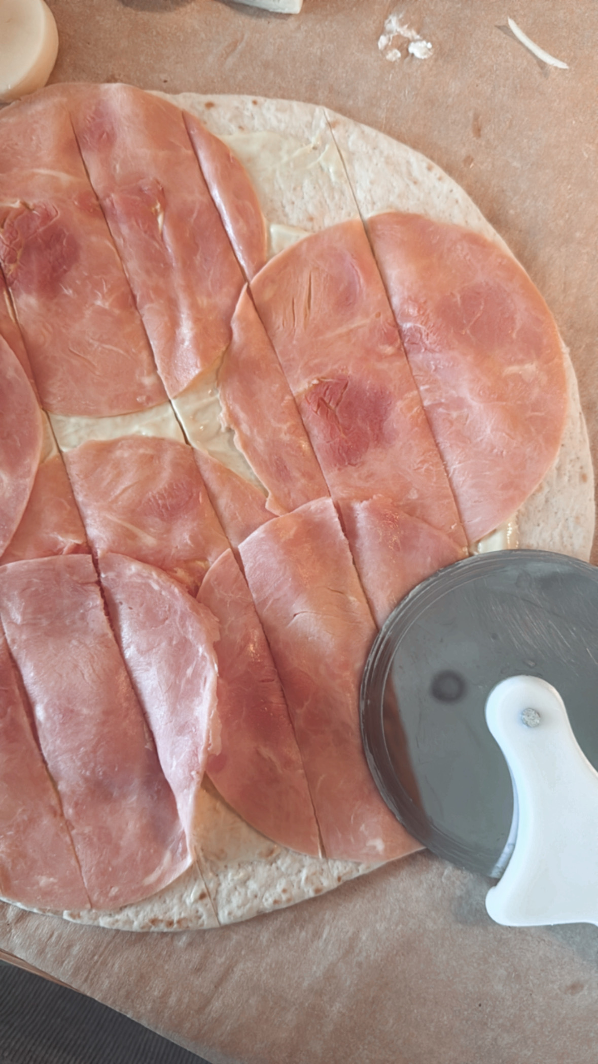 - Krájanie pásikov: Tortillu so šunkou a syrom nakrájaj na pásiky (šírka cca 4-5 cm). Použi kolieskový krájač na jednoduchšie a rovné rezy.