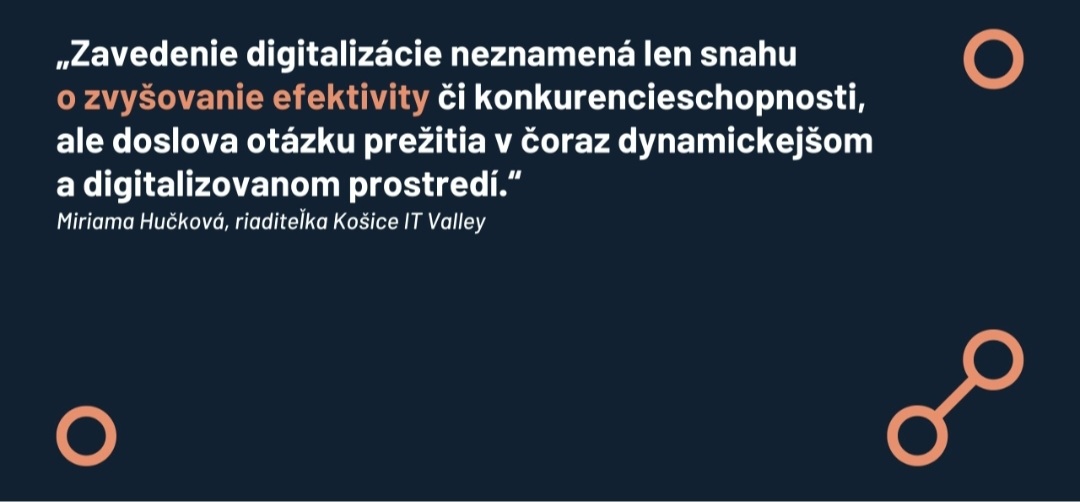 „Vnímam otvorenosť firiem, chuť vzdelávať sa a zapájať sa do pilotných projektov či testovaní technológií. Zároveň si však uvedomujem, že pred nami je ešte veľa práce. Digitalizácia je dlhodobý proces, ktorý si vyžaduje nielen technické riešenia, ale aj zmenu myslenia a spôsobu fungovania.” Pre mnohé podniky z jej pohľadu pritom zavedenie digitalizácie neznamená len snahu o zvyšovanie efektivity či konkurencieschopnosti, ale doslova „otázku prežitia v čoraz dynamickejšom a digitalizovanom prostredí”.