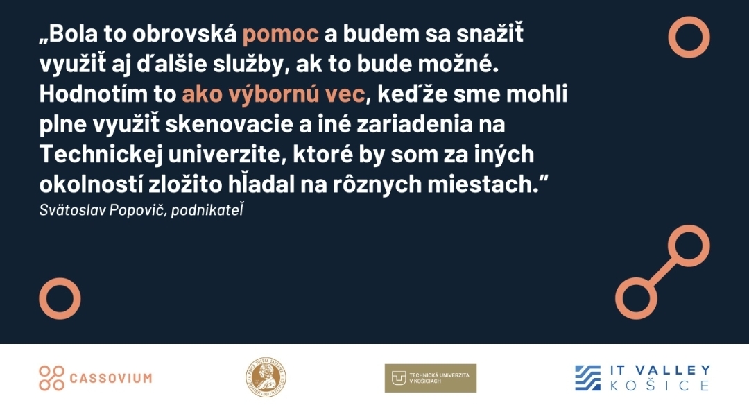 „Bola to určite obrovská pomoc a budem sa snažiť využiť aj ďalšie služby, ak to bude možné. Hodnotím to ako výbornú vec, keďže sme mohli plne využiť skenovacie a iné zariadenia na Technickej univerzite, ktoré by som za iných okolností zložito hľadal na rôznych miestach. Už na predošlom projekte som spolupracoval s Fakultou výrobných technológií Technickej univerzity, čo mi odporučili z Ministerstva investícií, regionálneho rozvoja a informatizácie SR a od nich som sa neskôr dozvedel aj o EDIH Cassovium. Vnímam to ako mimoriadne prínosné,” zhodnotil spokojne.