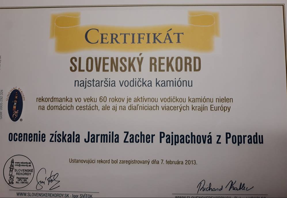Vodičský preukaz na kamión som si spravila ako 55 ročná, keď mi nepriznali starobný dôchodok. Práce nebolo na výber, tak som sa rozhodla ísť jazdiť na kamióne. K autám som mala stále blízko. A tieto okolností mi k tomu dopomohli. Som držiteľka slovenského rekordu ,,Najstaršia slovenská kamionistka.”