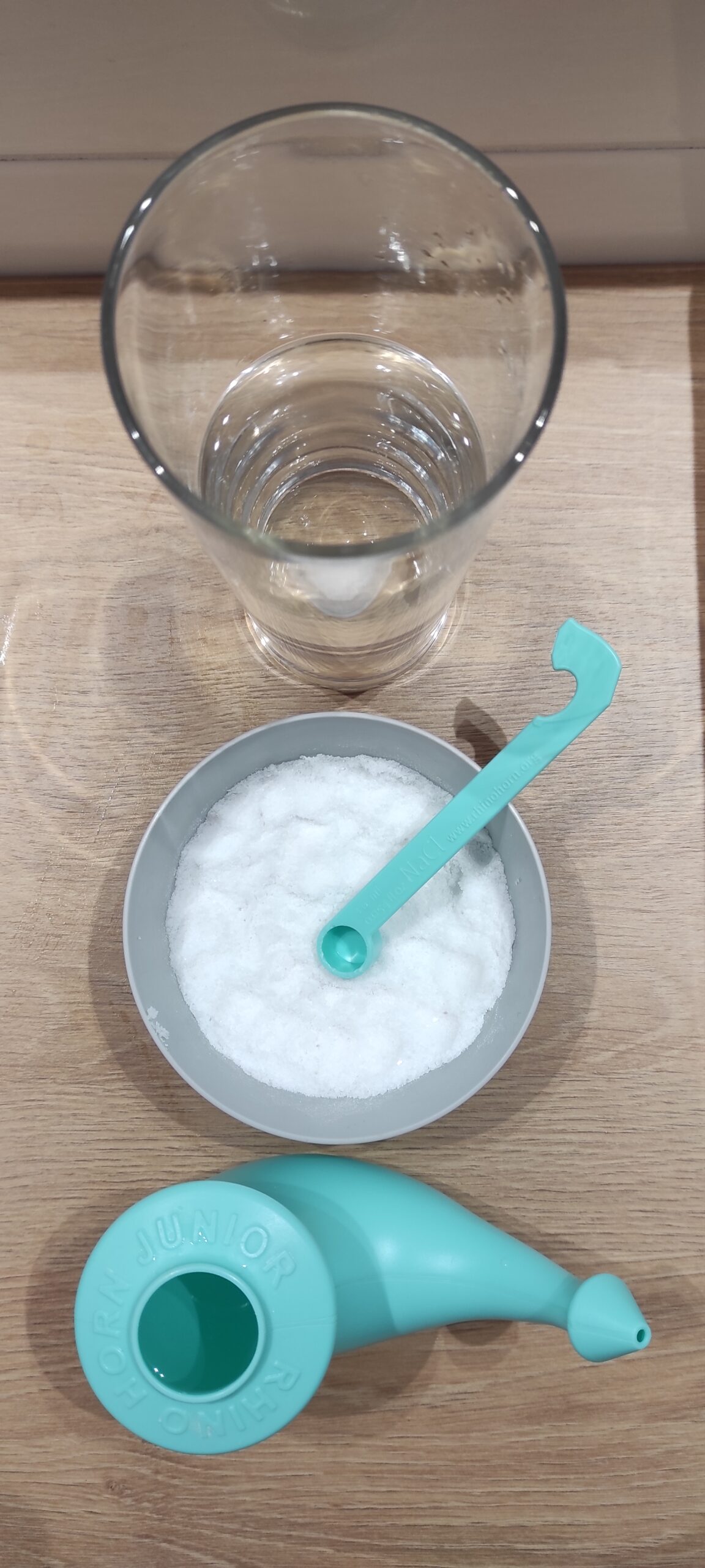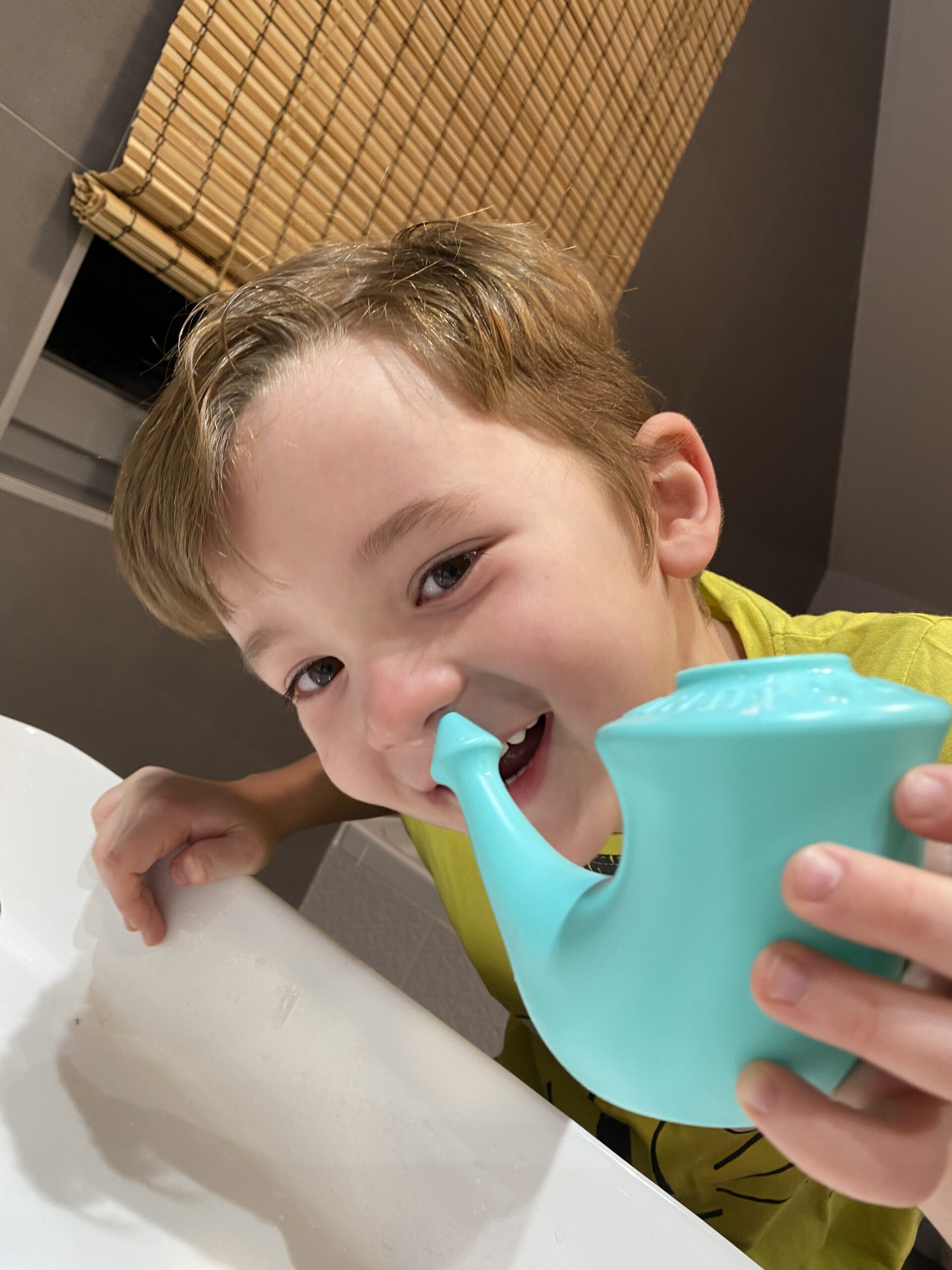 Po večernom sprchovaní u nás v kúpeľni nastáva chaos. Každé dieťa si chce vybaviť tie svoje rituály, čo najlepšie a najrýchlejšie. Päť ročný syn začína výplachom nosa. Do otvoru navrchu konvičky mu nalejem zohriatu prevarenú vodu a on si do nej sám pridá presne zarovnanú odmerku soli. Mieša si tento koktejl úplne samozrejme, zatiaľ, čo mi vysvetľuje niečo zo sveta super hrdinov. „Ideme nato?“, pýtam sa a postavím sa za neho. Jemne sa dlaňou oprie o moju ruku, predkloní hlavu a sám si priloží konvičku k pravej dierke. Vie, že počas toho sa nerozpráva a celá procedúra trvá len pár sekúnd. Spoločne potom nos jemne vyfúkame a postup zopakujeme na druhej strane. Niekedy sa mu podarí spraviť výplach tak dobre, že voda z pravej dierky vytečie z tej druhej a naopak. Stane sa, že si len poriadne prepláchne jednu aj druhú stranu, keďže deti mávajú noštek upchatý. Koniec koncov aj na obrúsku po smrkaní vidieť, koľko toho mal v nose. Často si dokonca nos vypláchne úplne sám, ja ho len kontrolujem. Konvička sa odporúča od troch rokov veku, no niektoré deti to zvládnu aj skôr. Naša trojročná dcéra si tiež túto procedúru už dokáže urobiť sama, dohliadam u nej predovšetkým na správne jemné vysmrkanie nosa.