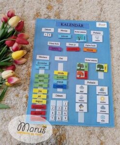 Edukativny kalendár, kde si vaše deti precvičia ročné obdobia, mesiace a dni v týždni. Je vhodný pre deti od 3 rokov. Vďaka tejto pomôcke sa deti začínajú orientovať v čase, ročnom období, všímajú si počasie a začínajú vnímať pojmy ako “včera, dnes, zajtra”. Taktiež sa ním naučia mesiace v roku, dni v týždni.