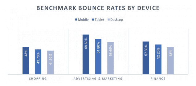 Nakoniec sa môžeme pozrieť na referenčné miery odchodov podľa zariadenia. Rovnaký vzor vidíme konzistentne vo všetkých odvetviach: používatelia mobilných zariadení odchádzajú viac ako používatelia počítačov, pričom používatelia tabletov sú niekde uprostred. Dôvody týchto rozdielov sú intuitívne, pričom používatelia mobilných zariadení s väčšou pravdepodobnosťou menia ohniská a presúvajú sa medzi rôznymi aplikáciami ako používatelia počítačov.