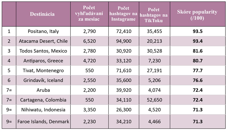 Na štvrtom mieste je ďalšia slnečná destinácia, Antiparos v Grécku, ktorá dosiahla skóre popularity 80,7/100. Krásny grécky ostrov zhromažďuje v priemere 4 720 globálnych mesačných vyhľadávaní – druhý najvyšší počet, hneď po púšti Atacama v Čile. Prítomnosť Antiparosu na sociálnych sieťach je tiež významná, keďže vygeneroval 33 120 hashtagov na Instagrame a 7 230 hashtagov na TikTok-u. Tento tichý kykladský ostrov jednoznačne naberá na obrátkach a priťahuje páry hľadajúce grécku ostrovnú mágiu bez davov, ktoré zvyčajne bývajú na Mykonose.
