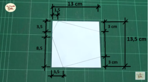 Aby ste určili správny rozmer, môžete si maketu nakresliť najprv na papier. Na prvom obrázku sú rozmery. Ľavú, širšiu časť musíte vystrihnúť do oblúka. Ak máte doma klasickú rúšku, preložte ju napoly, roztiahnite a obkreslite na preloženú látku.