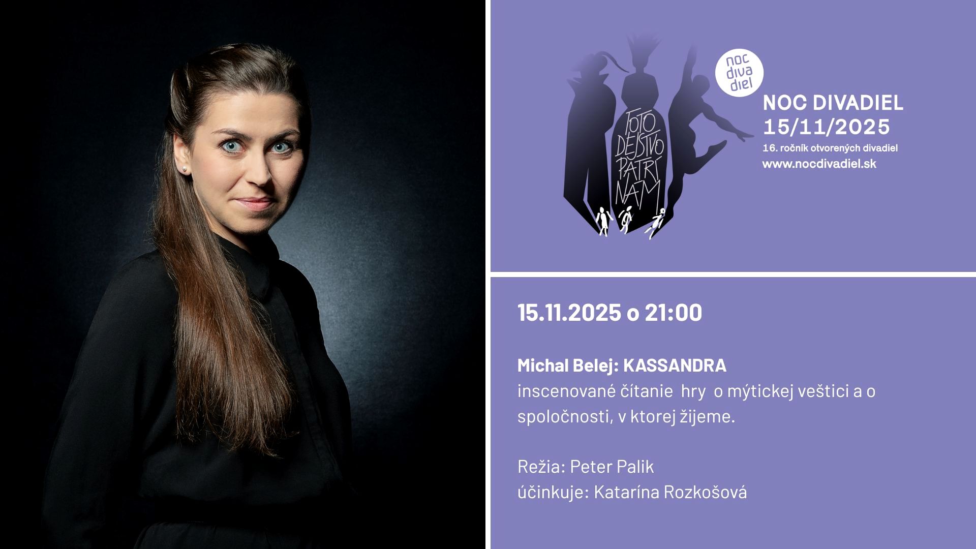 Zvolenské divadlo prvý raz uvedie inscenované čítanie nového dramatického textu Kassandra. Sugestívna hra Michala Beleja získala druhé miesto v súťaži Dráma 2024 a zároveň bola ocenená tromi špeciálnymi cenami. Text prostredníctvom mýtickej veštice Kassandry vypovedá nielen o osude ženy, „ktorá má dar a prekliatie”, ale jej príbeh autor spojil s viacerými absurditami súčasnej spoločnosti.