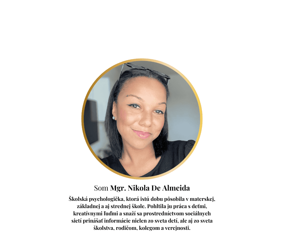 Mgr. Nikola de Almeida je školská psychologička, ktorá istú dobu pôsobila v materskej, základnej a aj strednej škole. Pohltila ju práca s deťmi, kreatívnymi ľuďmi a snaží sa prostredníctvom sociálnych sietí prinášať informácie nielen zo sveta detí, ale aj zo sveta školstva, rodičom, kolegom a verejnosti. Zároveň bude pre vás pripravovať pravidelný obsah na tému psychológia.