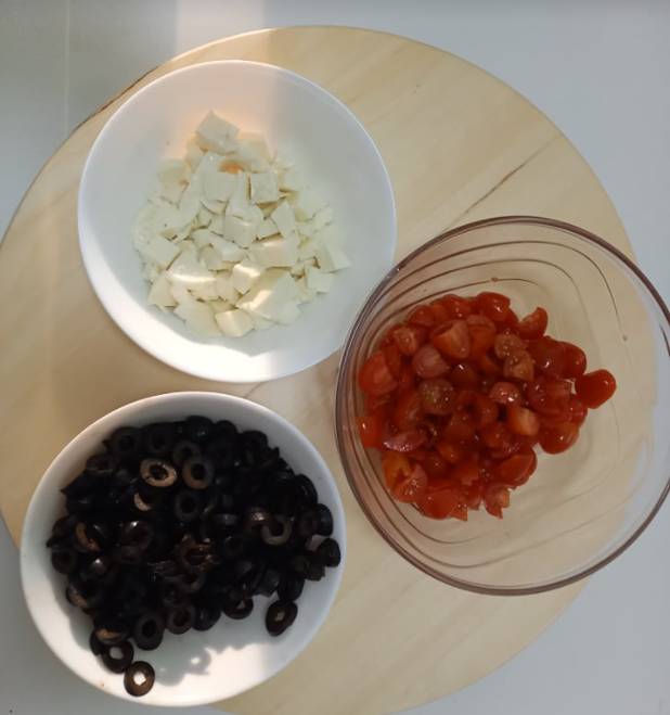 - Nakrájate na drobné kolieska čierne olivy, paradajky a mozarellu.
