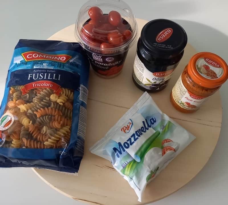 - Primiešame nakrájané olivy, mozarellu a paradajky. Zamiešame.