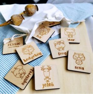 Pexeso z dreva, ktoré sa len tak ľahko nestratí a nepokrčí. Viete, ako sa po anglicky povie jeleň? A líška? Máte príležitosť sa to naučiť spolu s vašimi deťmi. Hravou a pozitívnou formou. Precvičíte si postreh, pamäť a obnovíte slovnú zásobu. Pexeso je možné vyrobiť aj v nemeckej verzii.