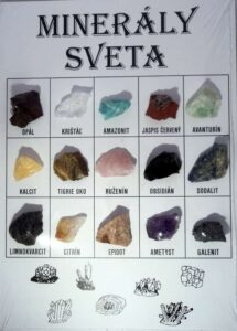 Zbiera vaše dieťa kamene? Dajte mu príležitosť naučiť sa názvy a tvary rôznych druhov polodrahokamov či minerálov sveta.15-20 druhov kameňov nalepených na karte s názvami ako býčie či tigrie oko, jaspis, ametyst či krištáľ, pohltí malého bádateľa do študovania kamenných prírodných krás.