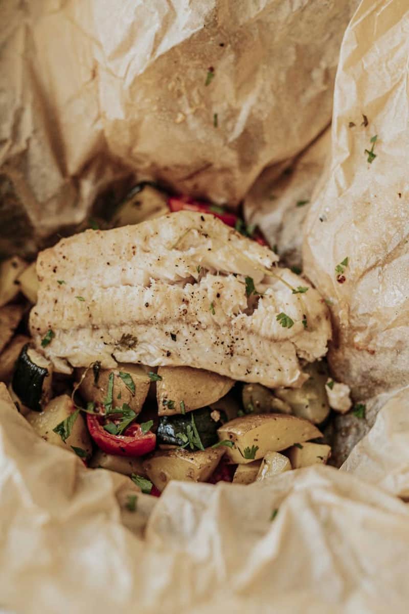 - Na dno každého papiera lyžicou ukladáme zeleninu, bez šťavy ktorá sa nám vytvorila. Na vrch uložíme kúsok ryby.