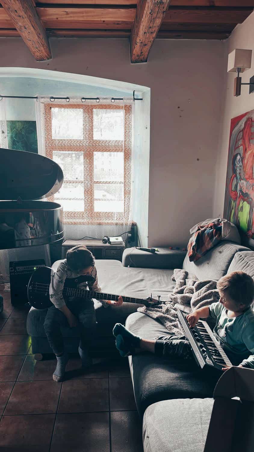 U nás ide hudba nonstop. Nikdy nebýva ticho. A ak aj predsa len nastane, vieme, že sa niečo deje. (Smiech.) Chalani hrajú na klavír a trénujú a cvičia každý deň. A postupne k tomu pridávajú aj iné nástroje. Okrem toho samozrejme Oskar stále pracuje, čiže ho vždy vidia robiť niečo s hudbou. Je to pre nich inšpiratívne prostredie, a v podstate aj pre mňa.
